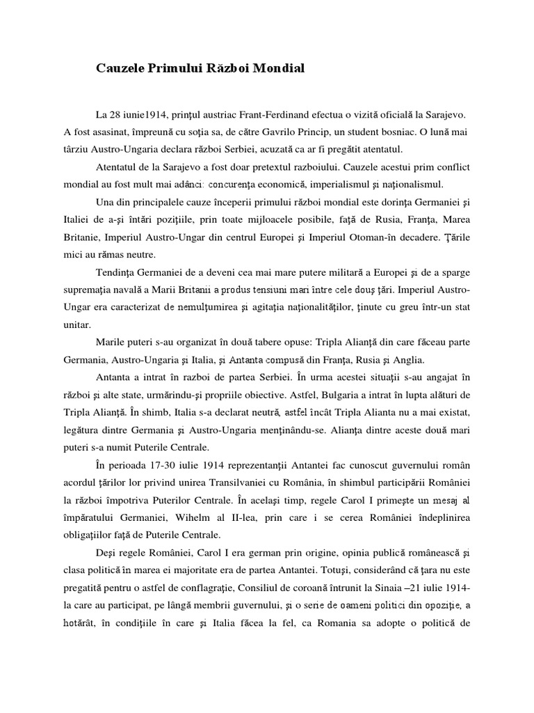Criza care a dus la începerea primului război mondial s a produs în 1914 ca urmare a asasinării lui franz ferdinand moştenitorul tronului austro ungariei de către un student sârb. Cauzele primului război mondial. 9 10 bosnia a fost anexată de către imperiul austro ungar în 1908 în disprețul sentimentelor sau dorințelor populației austro ungaria însăși fiind deja la acel moment un stat multi etnic în care numeroase minorități erau dominate de o clică de nemți și unguri. Cauza principală a primului război mondial a fost refuzul imperiilor de a acorda populațiilor lor dreptul la auto determinare.