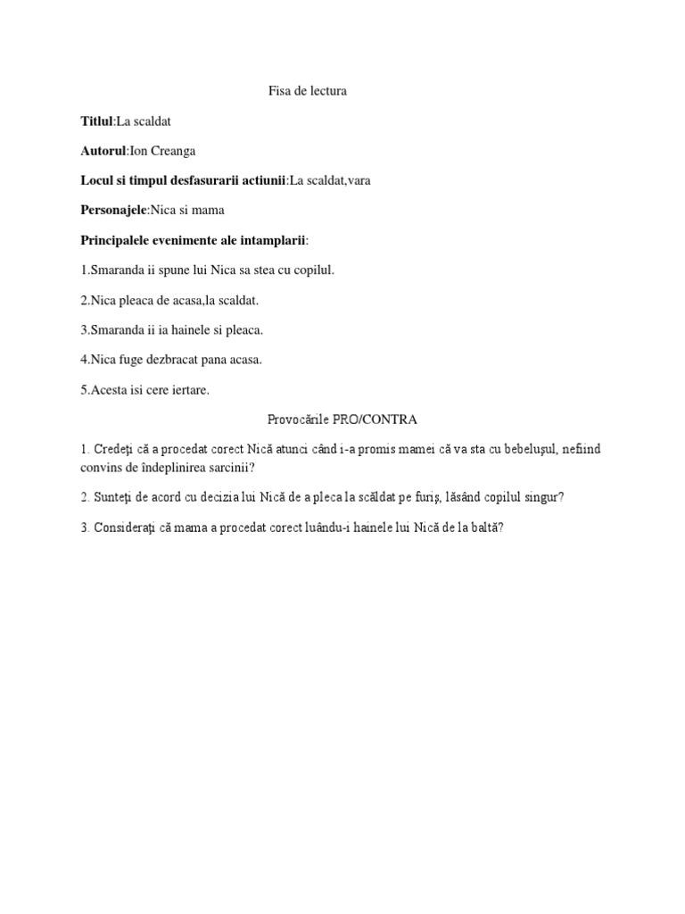 La scăldat de ion creangă într o zi pe aproape de sânt ilie se îngrămădise ca mai totdeauna o mulţime de trebi pe capul mamei. Fisă la scaldat dupa ion creanga fisa de lucru evaluativa la textul la scaldat dupa ion creanga. Amintiri din copilarie la scaldat. Odata vara pe aproape de mosi ma furisez din casa si ma duc ziua n amiaza mare la mos vasile fratele tatei cel mai mare sa fur niste cirese.