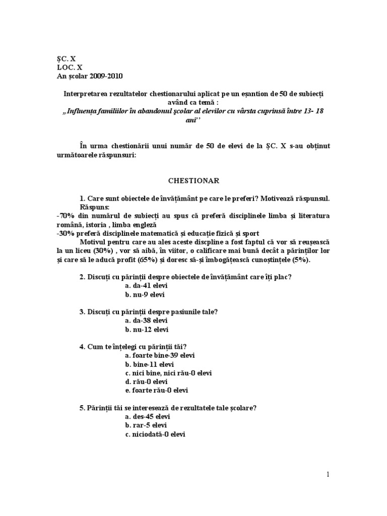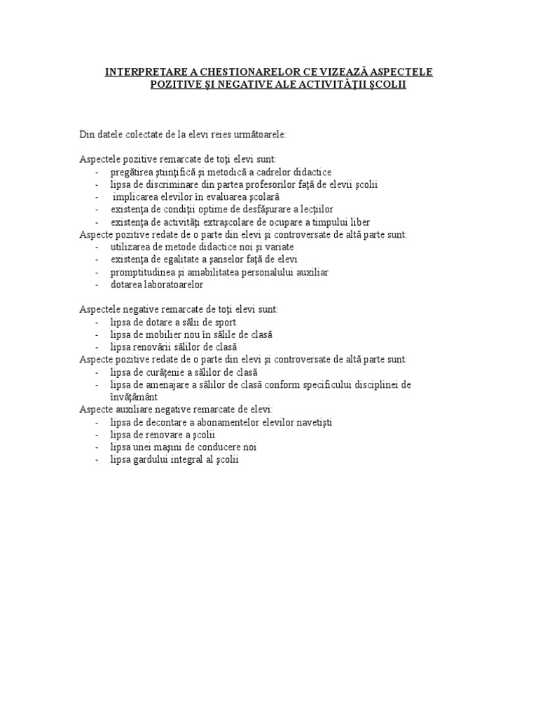 Interpretare A Chestionarelor Ce Vizează Aspectele Pozitive Si Negative Ale Activităţii Scolii