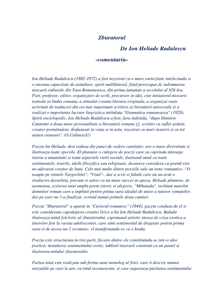 Ion heliade radulescu descrie acest mit al zburatorului in poezia intitulata zburatorul dar tema o intalnim la aproape toti scriitorii pasoptisti 1968. Poezia zburătorul apărută în curierul românesc nr. Comentarii zburatorul de ion heliade radulescu comentarii aceasta poezie aparuta pentru prima data in curierul romanesc nr. La baza acestei poezii sta basmul calin nebunul si cuprinde opt parti fragmente iar partea din manual este cea de a opta ultima.